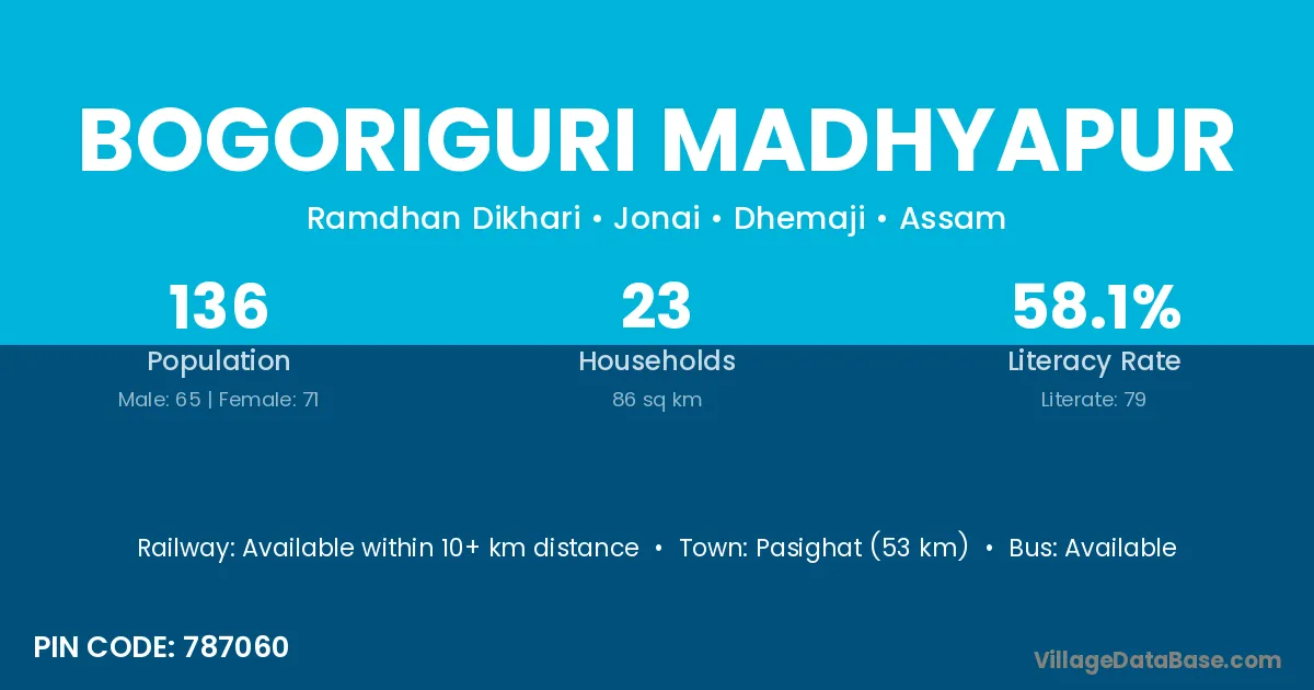 Pasighat (53 km) is the nearest town to Bogoriguri Madhyapur village for major economic activities and is located approximately 53 km away.