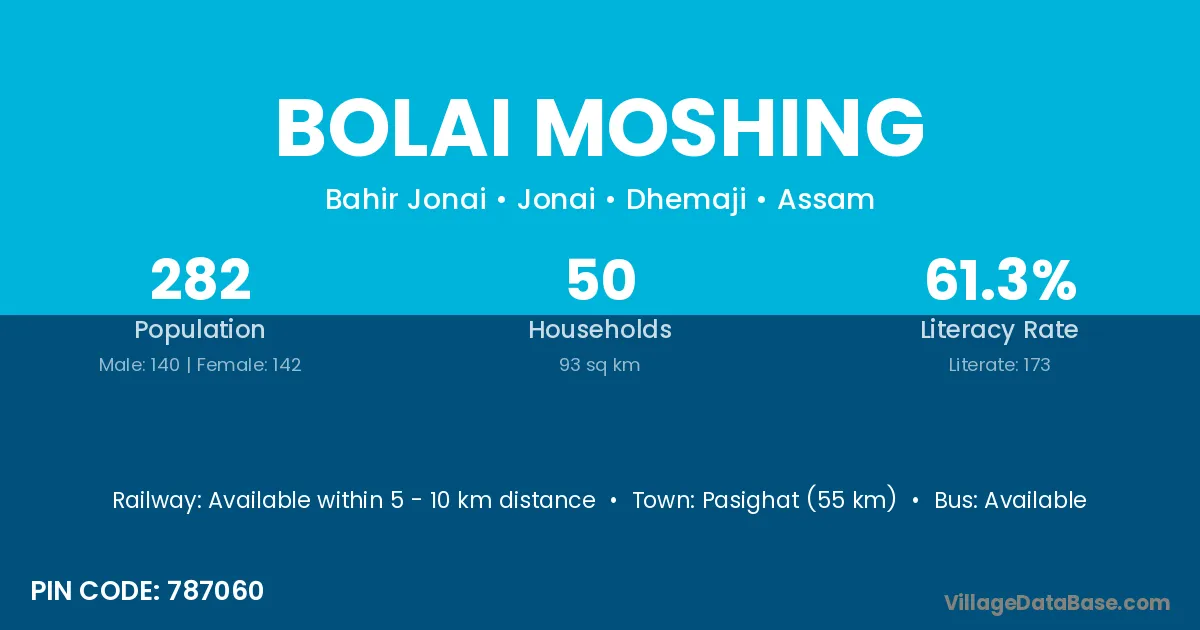 The literacy rate of Bolai Moshing village is 61.35%. Male literacy stands at 63.57% and female literacy at 59.15%.