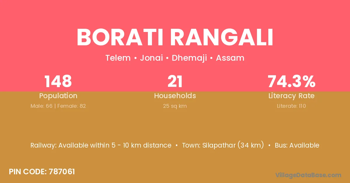 Silapathar (34 km) is the nearest town to Borati Rangali village for major economic activities and is located approximately 34 km away.