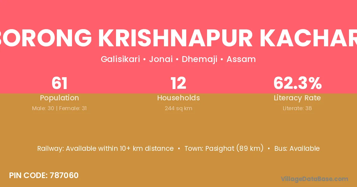 Borong Krishnapur Kachari village has a total population of 61 people, of which 30 are males and 31 are females.