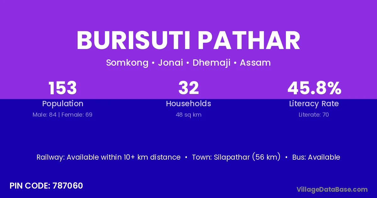 Silapathar (56 km) is the nearest town to Burisuti Pathar village for major economic activities and is located approximately 56 km away.