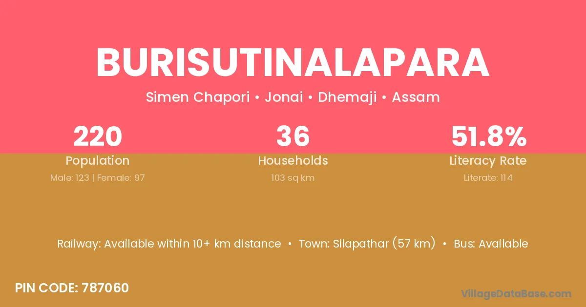 Silapathar (57 km) is the nearest town to Burisutinalapara village for major economic activities and is located approximately 57 km away.