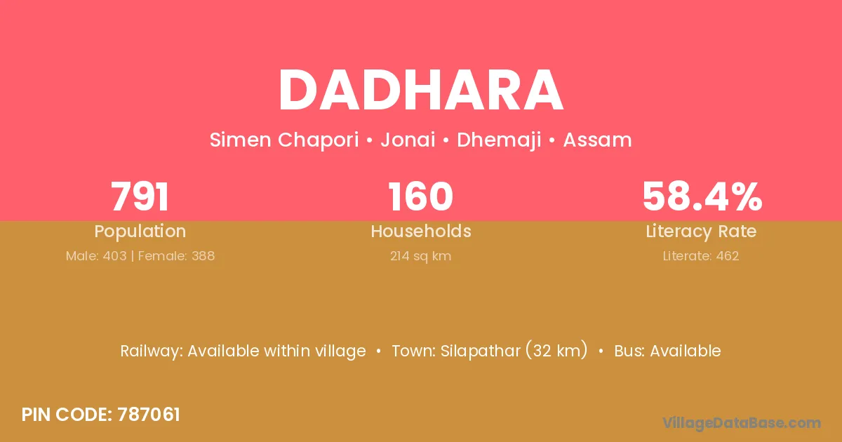 Silapathar (32 km) is the nearest town to Dadhara village for major economic activities and is located approximately 32 km away.