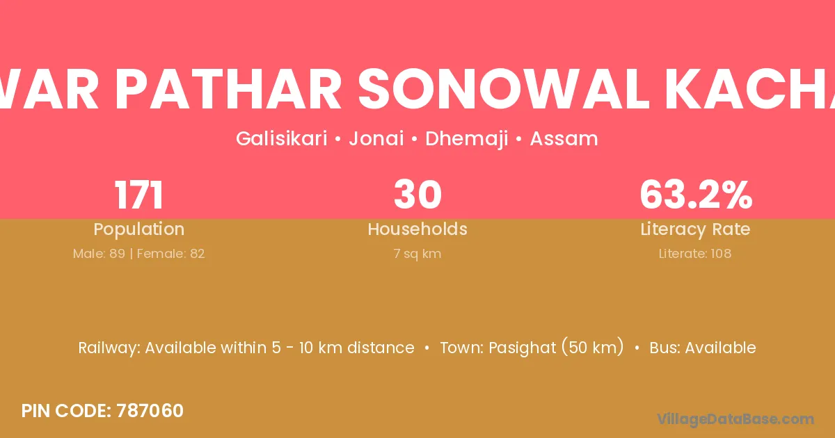 Iswar Pathar Sonowal Kachari village has a total population of 171 people, of which 89 are males and 82 are females.