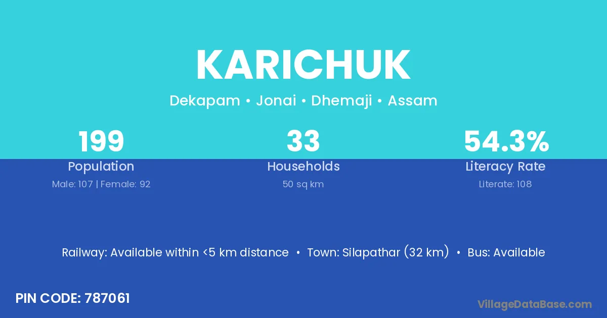 Silapathar (32 km) is the nearest town to Karichuk village for major economic activities and is located approximately 32 km away.