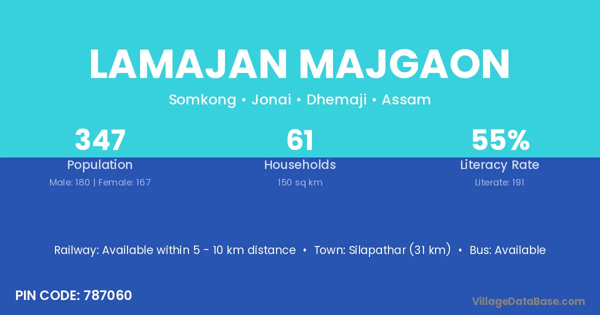 Silapathar (31 km) is the nearest town to Lamajan Majgaon village for major economic activities and is located approximately 31 km away.
