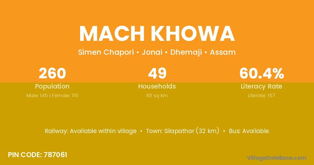 Silapathar (32 km) is the nearest town to Mach Khowa village for major economic activities and is located approximately 32 km away.