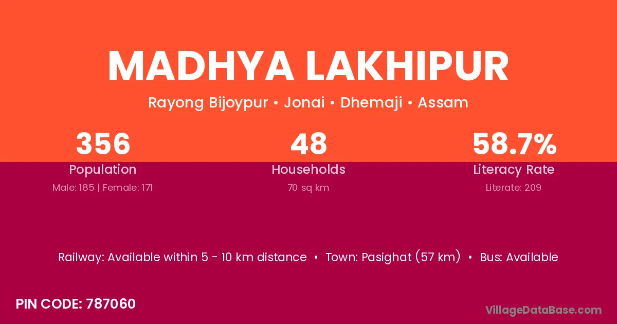 Pasighat (57 km) is the nearest town to Madhya Lakhipur village for major economic activities and is located approximately 57 km away.