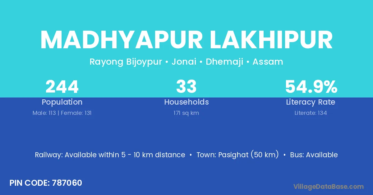 Pasighat (50 km) is the nearest town to Madhyapur Lakhipur village for major economic activities and is located approximately 50 km away.