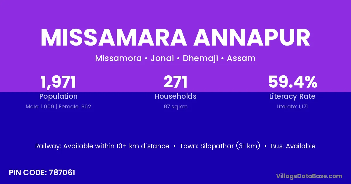 Silapathar (31 km) is the nearest town to Missamara Annapur village for major economic activities and is located approximately 31 km away.