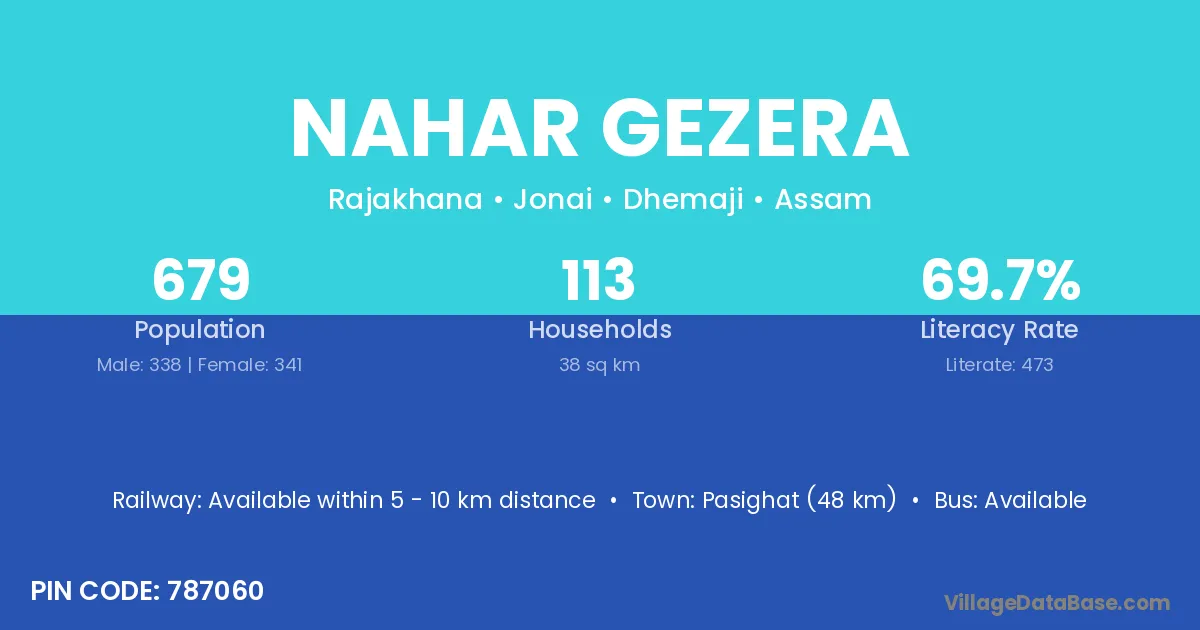 Pasighat (48 km) is the nearest town to Nahar Gezera village for major economic activities and is located approximately 48 km away.