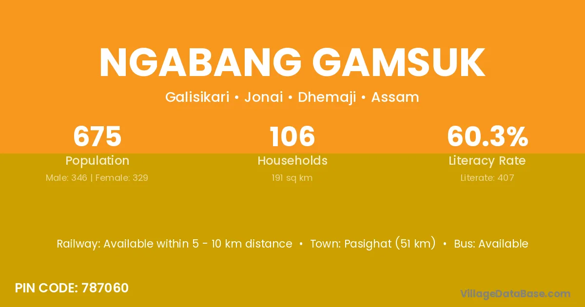 Pasighat (51 km) is the nearest town to Ngabang Gamsuk village for major economic activities and is located approximately 51 km away.