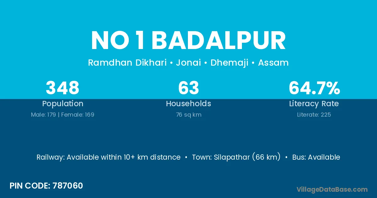 Silapathar (66 km) is the nearest town to No 1 Badalpur village for major economic activities and is located approximately 66 km away.