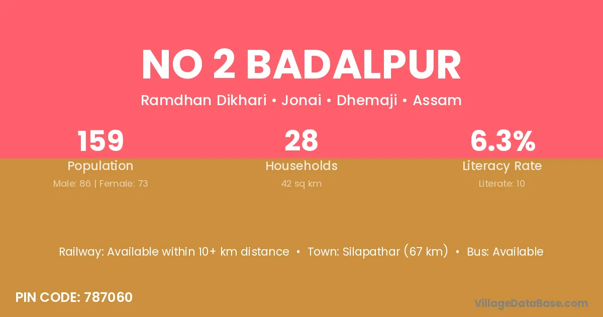 Silapathar (67 km) is the nearest town to No 2 Badalpur village for major economic activities and is located approximately 67 km away.