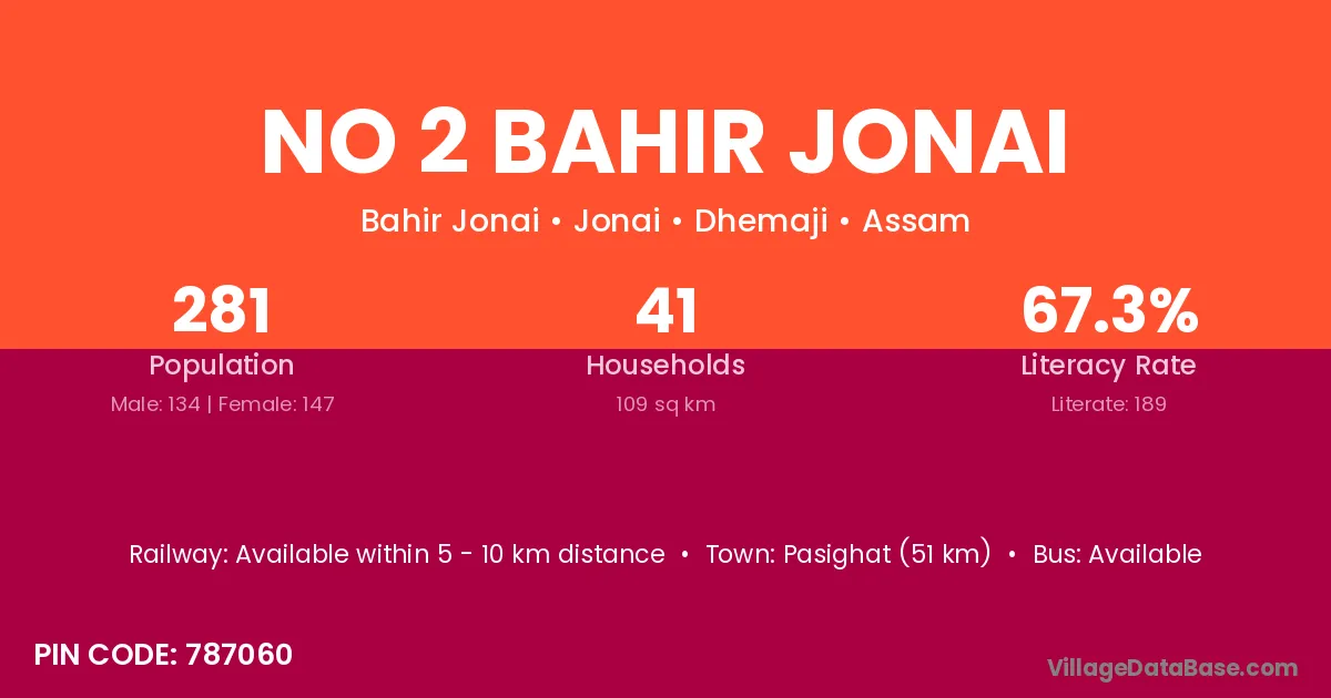 No 2 Bahir Jonai village has a total population of 281 people, of which 134 are males and 147 are females.