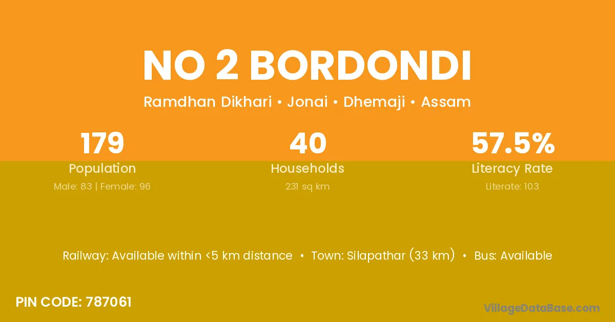 Silapathar (33 km) is the nearest town to No 2 Bordondi village for major economic activities and is located approximately 33 km away.