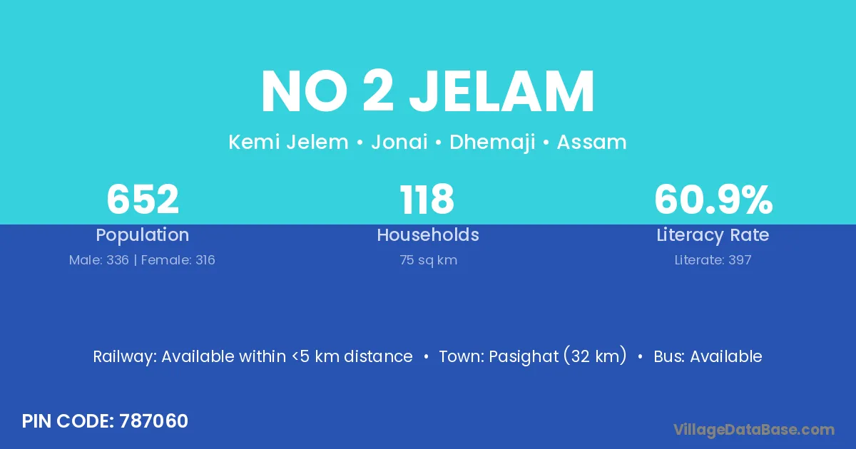 Pasighat (32 km) is the nearest town to No 2 Jelam village for major economic activities and is located approximately 32 km away.