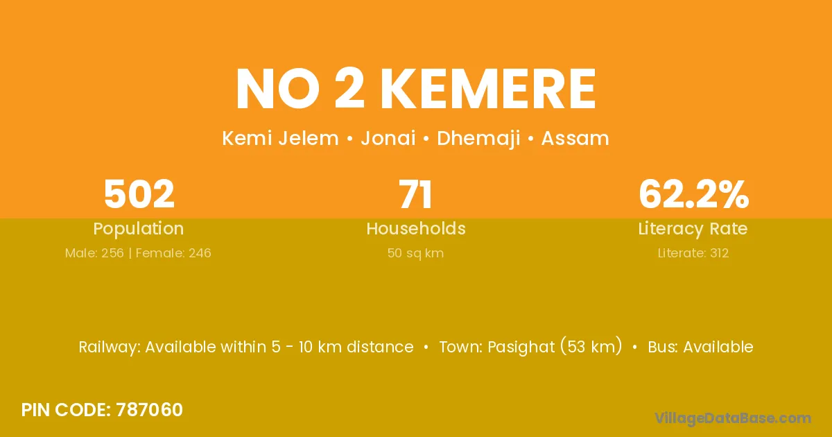 Pasighat (53 km) is the nearest town to No 2 Kemere village for major economic activities and is located approximately 53 km away.