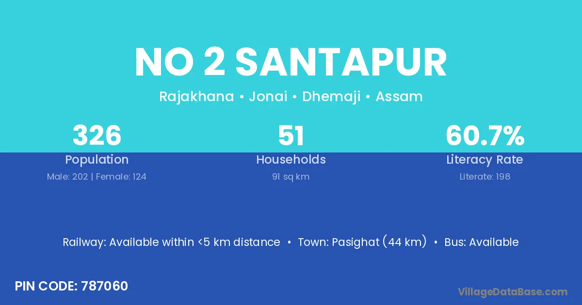 No 2 Santapur village has a total population of 326 people, of which 202 are males and 124 are females.