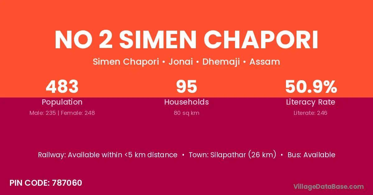 Silapathar (26 km) is the nearest town to No 2 Simen Chapori village for major economic activities and is located approximately 26 km away.