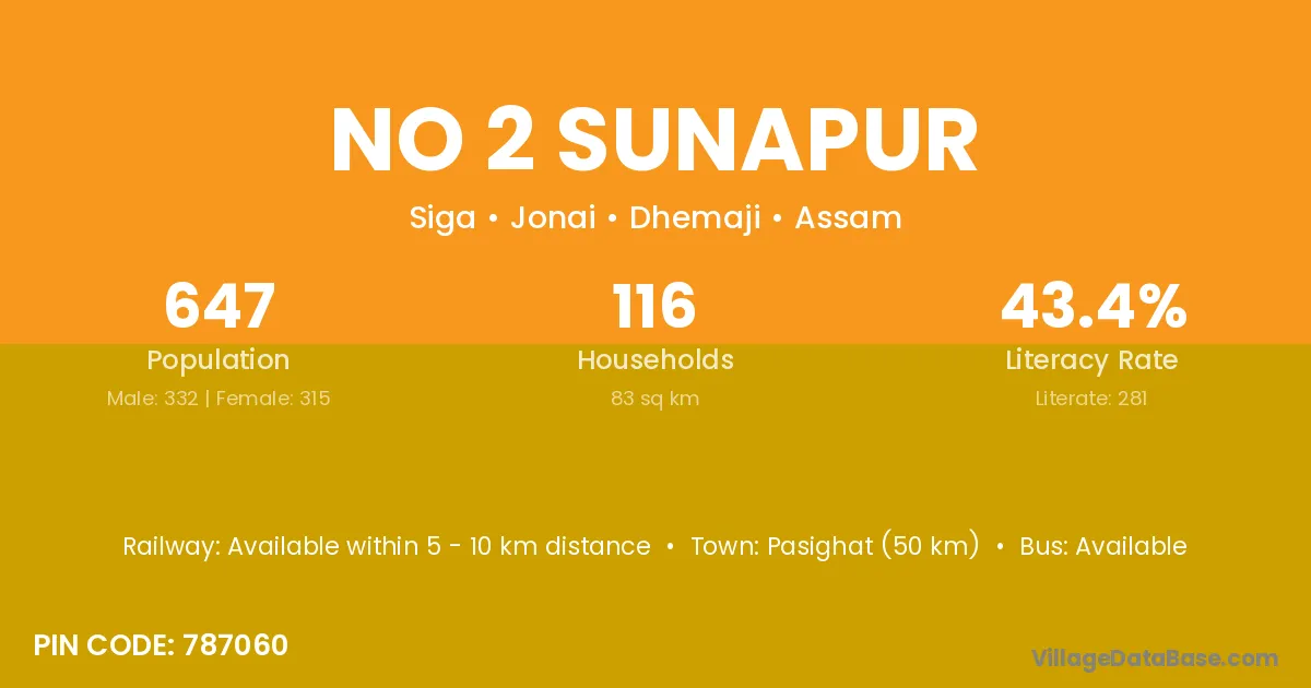 Pasighat (50 km) is the nearest town to No 2 Sunapur village for major economic activities and is located approximately 50 km away.
