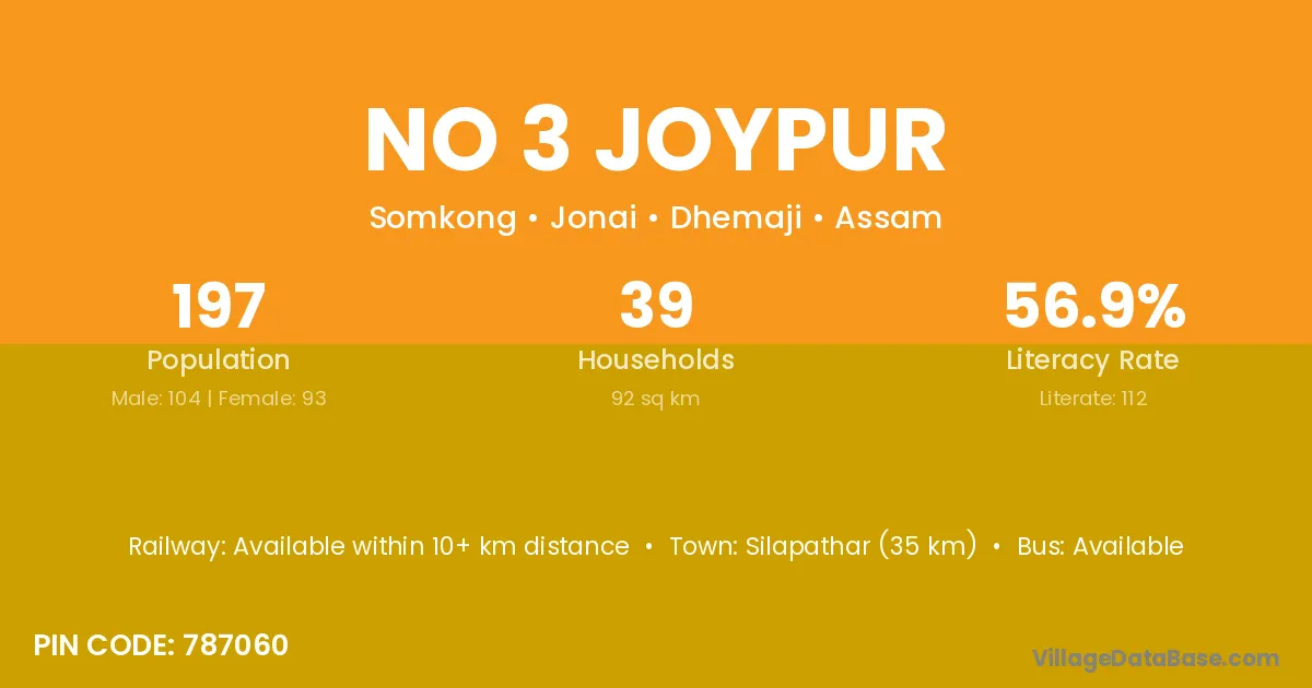 Silapathar (35 km) is the nearest town to No 3 Joypur village for major economic activities and is located approximately 35 km away.