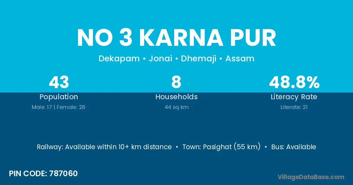 Pasighat (55 km) is the nearest town to No 3 Karna Pur village for major economic activities and is located approximately 55 km away.
