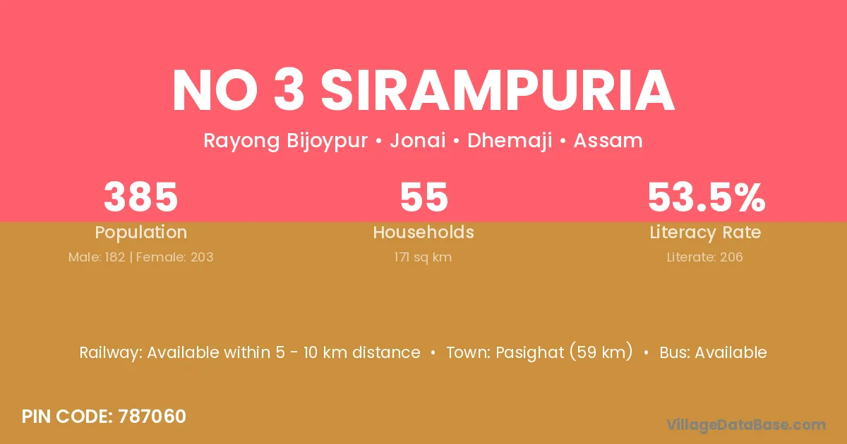 No 3 Sirampuria village has a total population of 385 people, of which 182 are males and 203 are females.