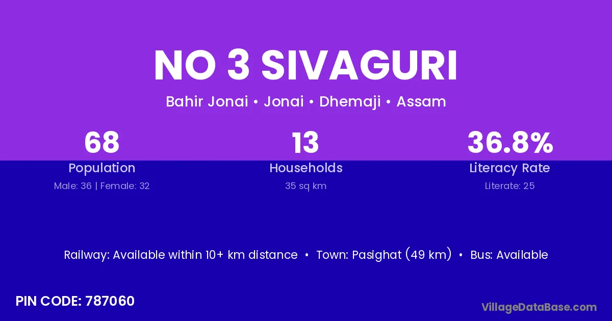 No 3 Sivaguri village has a total population of 68 people, of which 36 are males and 32 are females.