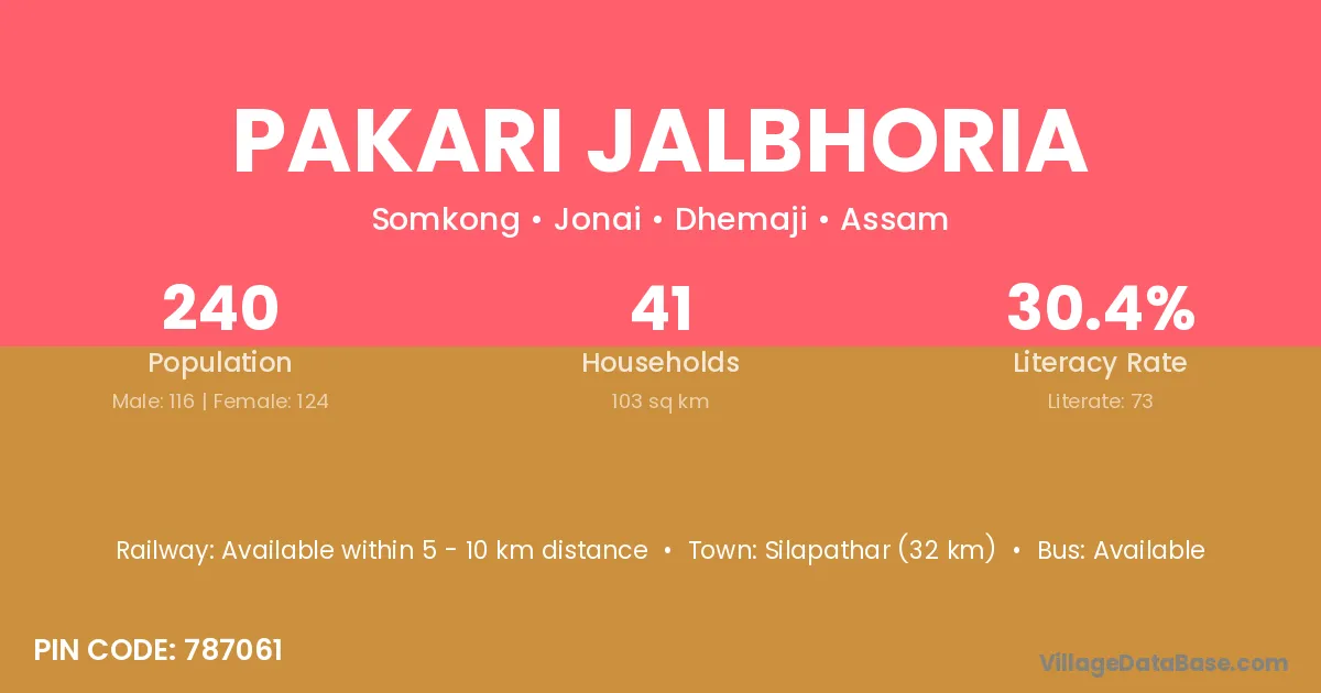 Silapathar (32 km) is the nearest town to Pakari Jalbhoria village for major economic activities and is located approximately 32 km away.