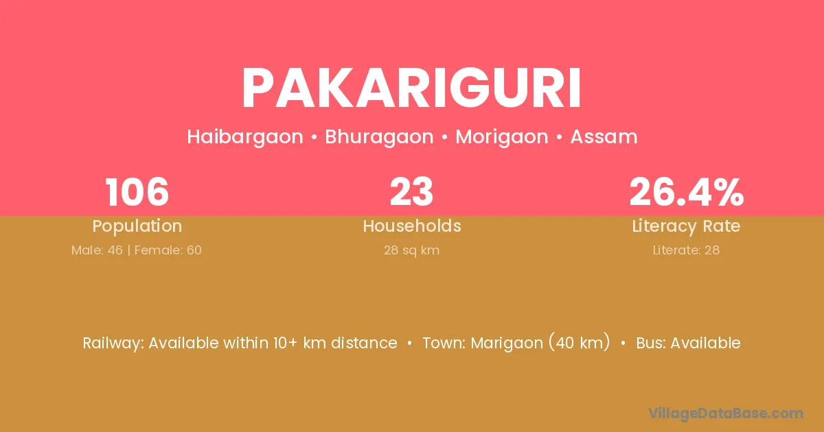 Silapathar (99 km) is the nearest town to Pakariguri village for major economic activities and is located approximately 99 km away.
