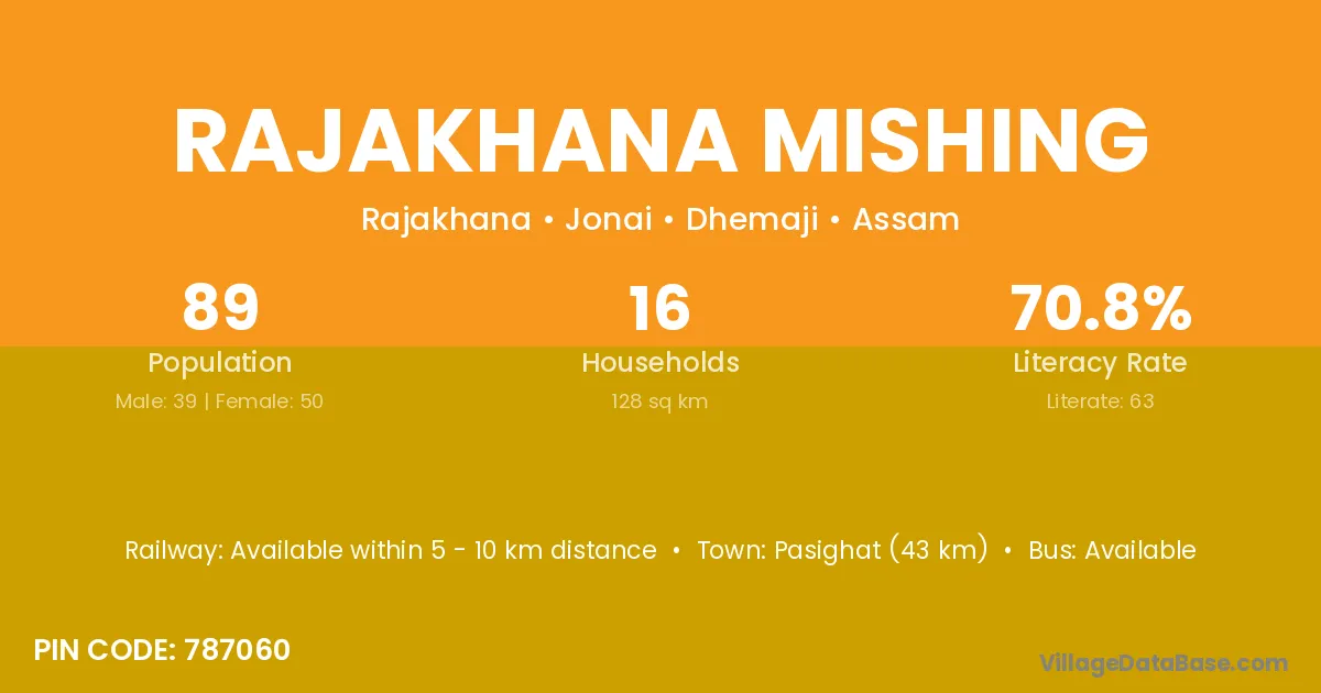 Rajakhana Mishing village has a total population of 89 people, of which 39 are males and 50 are females.