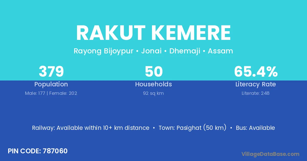 Pasighat (50 km) is the nearest town to Rakut Kemere village for major economic activities and is located approximately 50 km away.