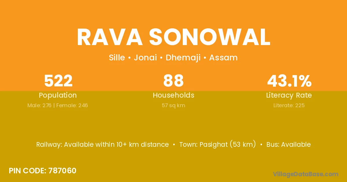 Rava Sonowal village has a total population of 522 people, of which 276 are males and 246 are females.
