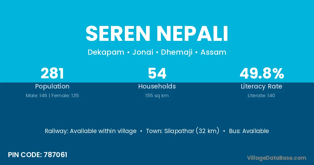 Silapathar (32 km) is the nearest town to Seren Nepali village for major economic activities and is located approximately 32 km away.