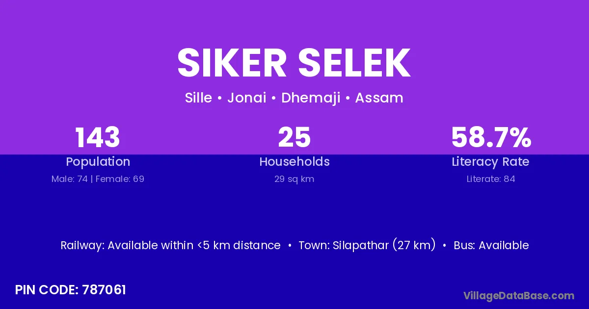 Silapathar (27 km) is the nearest town to Siker Selek village for major economic activities and is located approximately 27 km away.