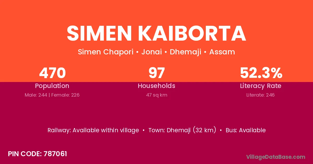 Dhemaji (32 km) is the nearest town to Simen Kaiborta village for major economic activities and is located approximately 32 km away.