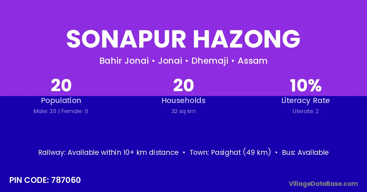 Sonapur Hazong village has a total population of 20 people, of which 20 are males and 0 are females.