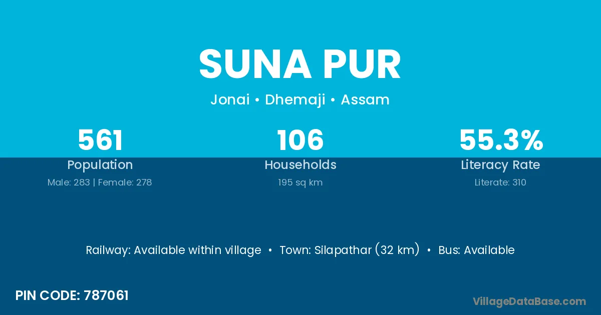 Silapathar (32 km) is the nearest town to Suna Pur village for major economic activities and is located approximately 32 km away.
