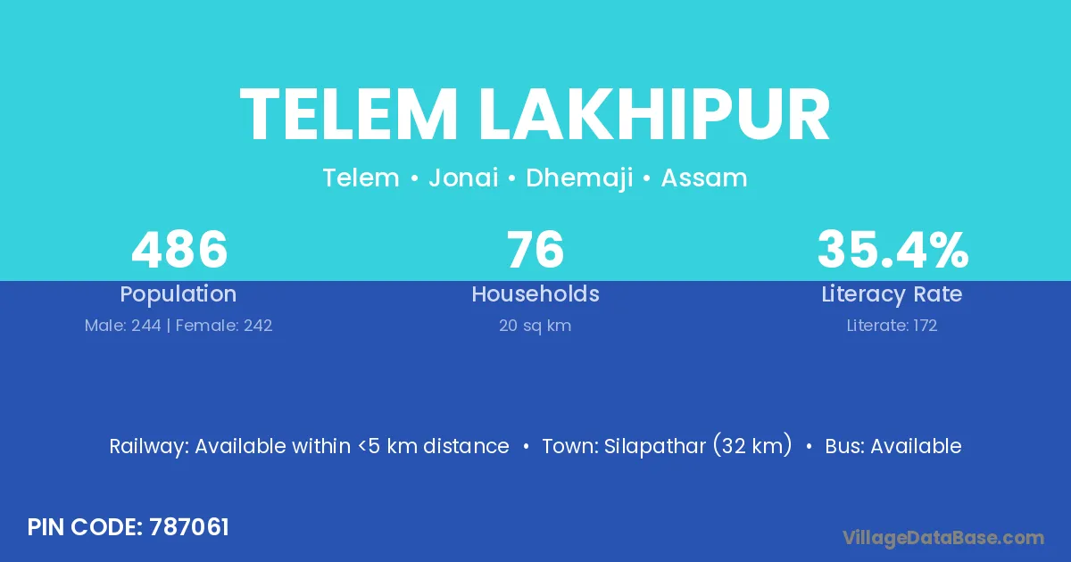 Silapathar (32 km) is the nearest town to Telem Lakhipur village for major economic activities and is located approximately 32 km away.