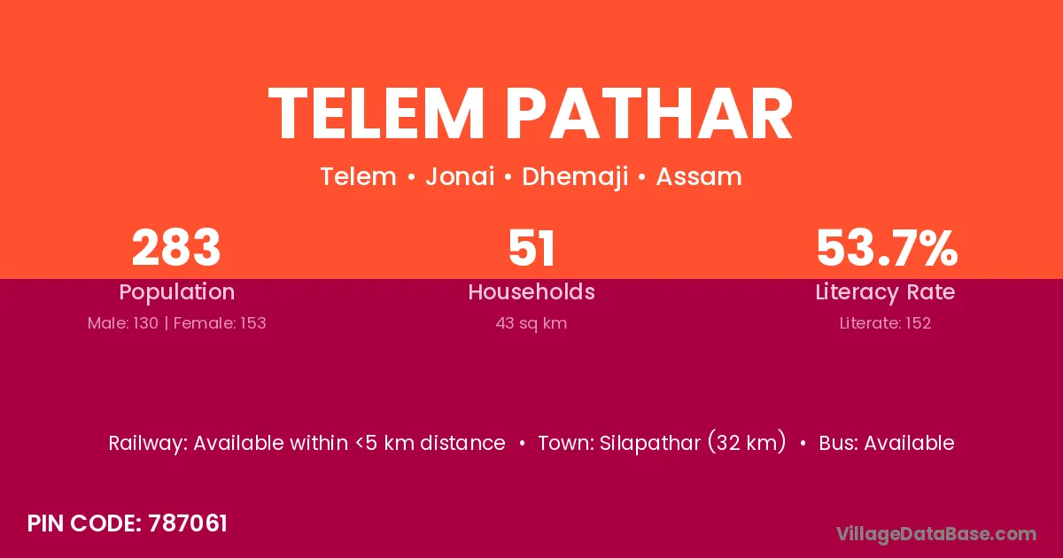 Silapathar (32 km) is the nearest town to Telem Pathar village for major economic activities and is located approximately 32 km away.