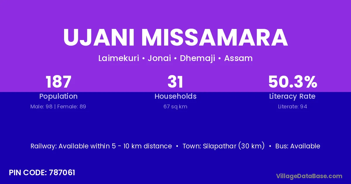Silapathar (30 km) is the nearest town to Ujani Missamara village for major economic activities and is located approximately 30 km away.