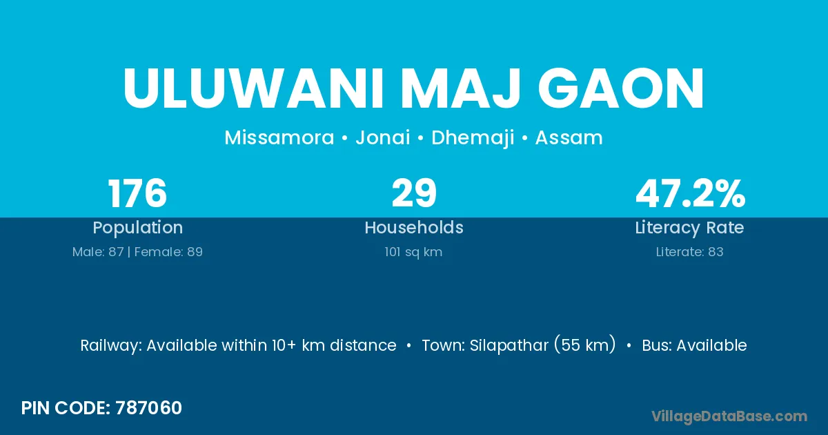 Silapathar (55 km) is the nearest town to Uluwani Maj Gaon village for major economic activities and is located approximately 55 km away.