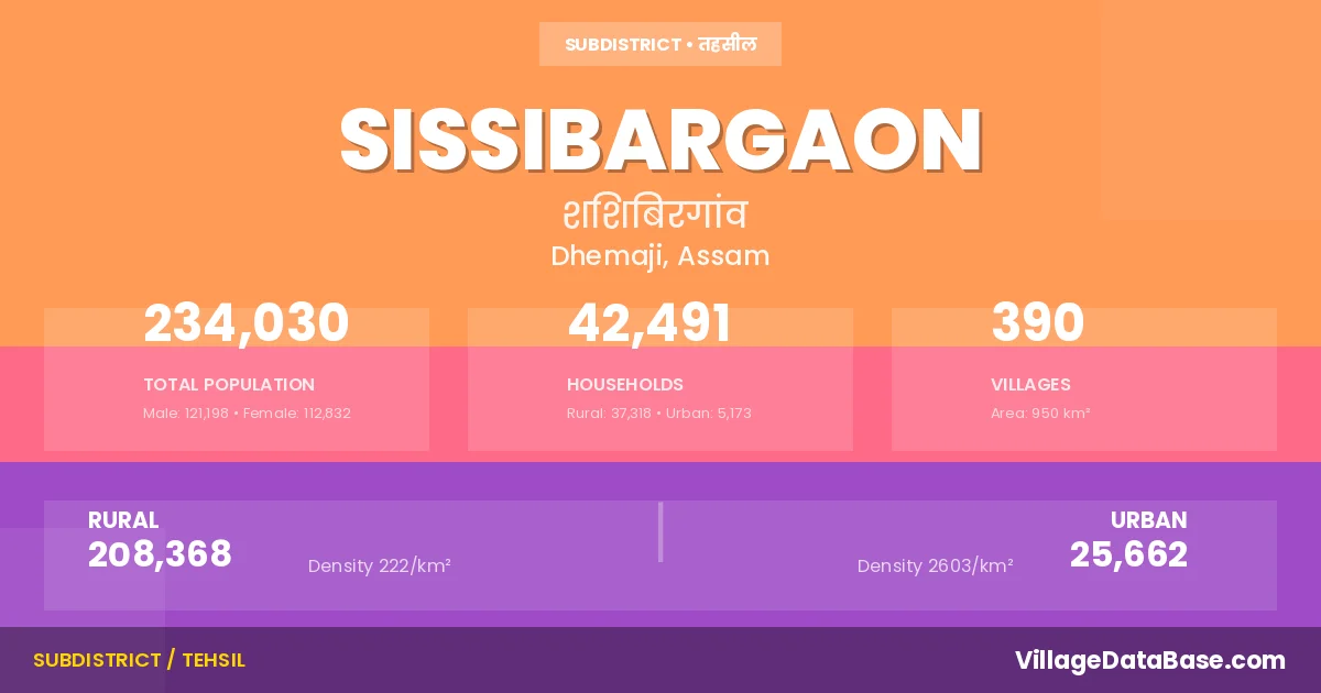 According to the 2011 census The total area of Sissibargaon Subdivision is 950 km², with a population of 234030 people. The population density is 246 inhabitants per square kilometre, and there are approximately 42491 houses in the sub district.