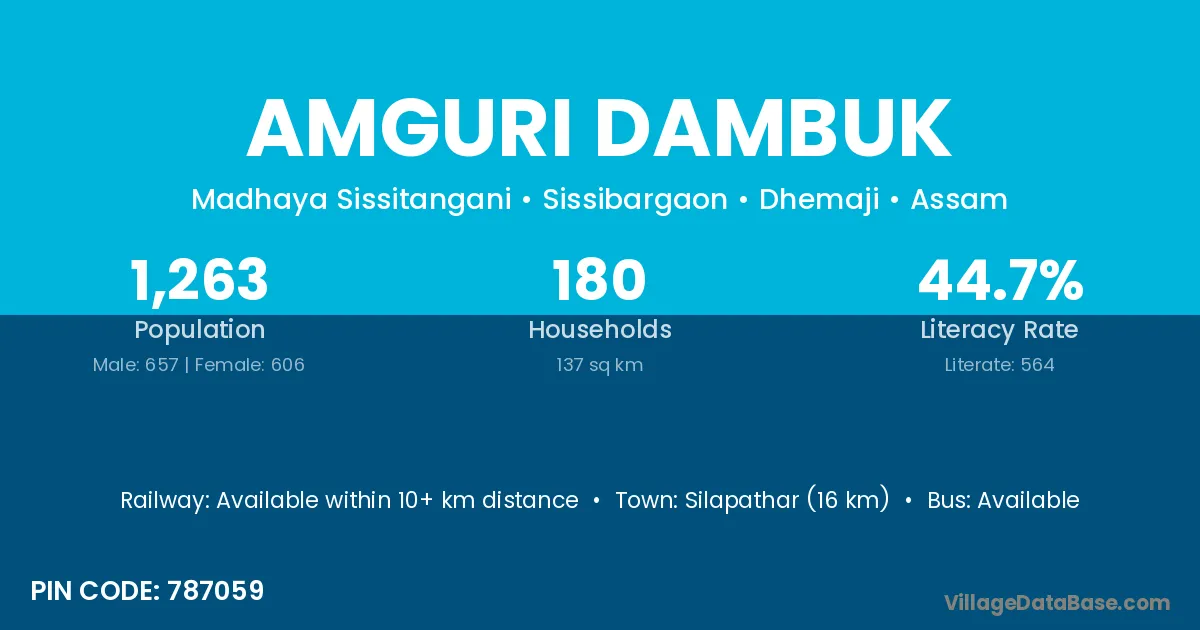 Silapathar (16 km) is the nearest town to Amguri Dambuk village for major economic activities and is located approximately 16 km away.