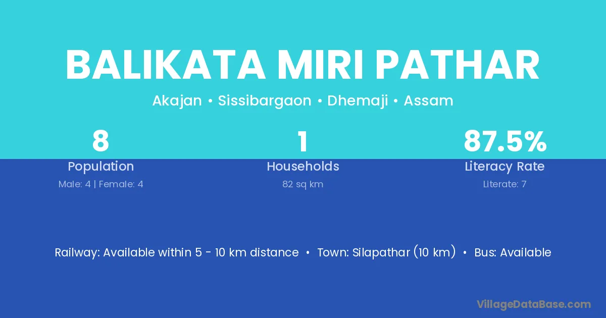 Balikata Miri Pathar village has a total population of 8 people, of which 4 are males and 4 are females.
