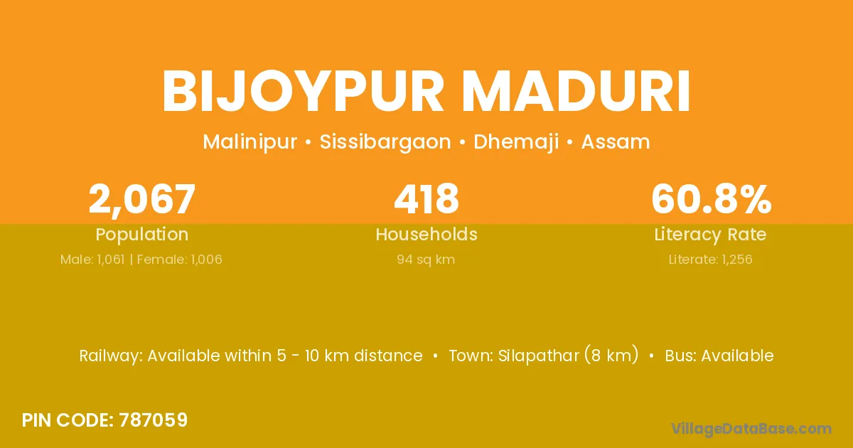 Silapathar (8 km) is the nearest town to Bijoypur Maduri village for major economic activities and is located approximately 8 km away.