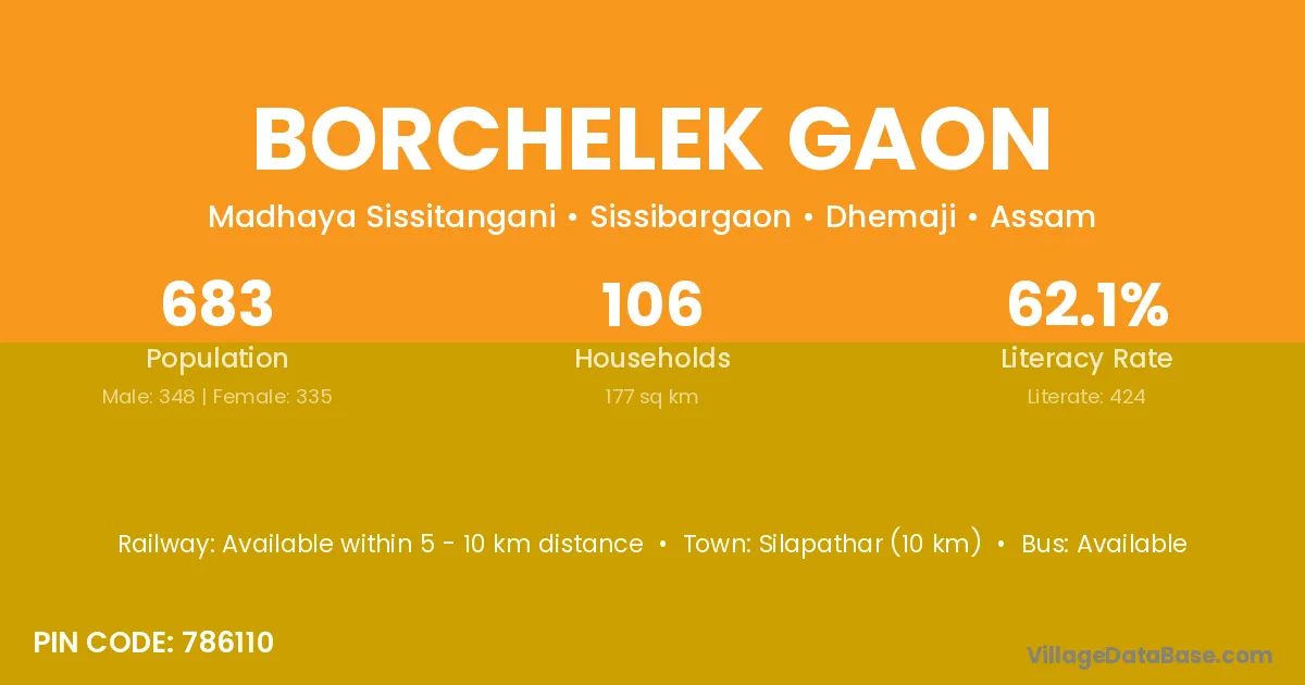 Silapathar (10 km) is the nearest town to Borchelek Gaon village for major economic activities and is located approximately 10 km away.