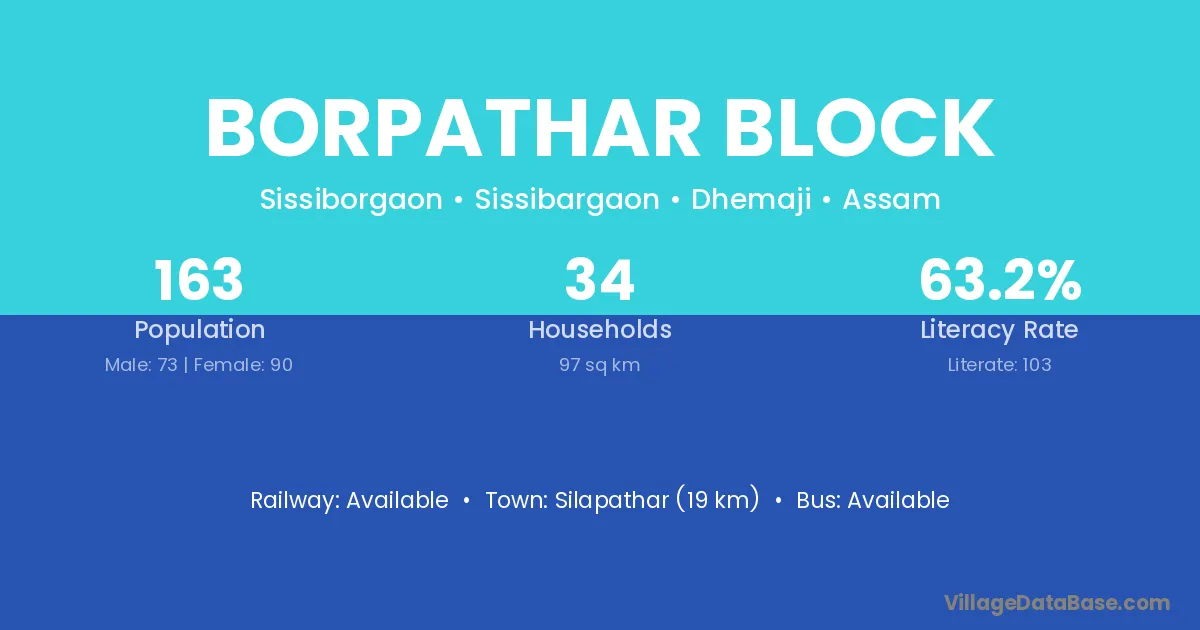 Silapathar (19 km) is the nearest town to Borpathar Block village for major economic activities and is located approximately 19 km away.