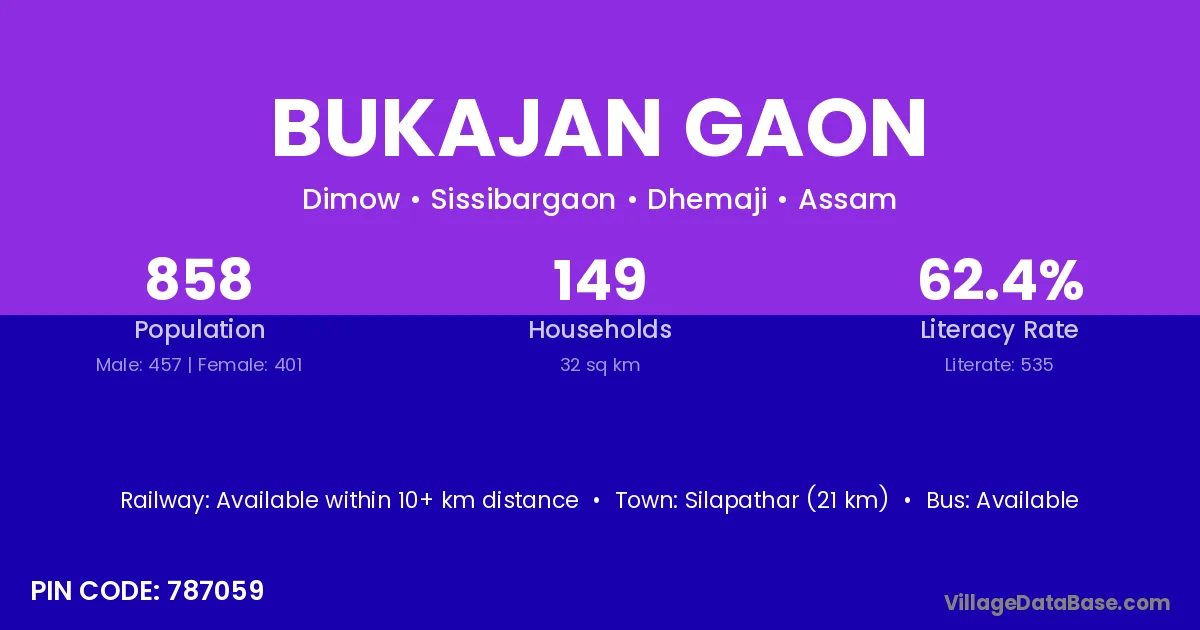 Silapathar (21 km) is the nearest town to Bukajan Gaon village for major economic activities and is located approximately 21 km away.